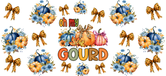 Un diseño vibrante con temática otoñal que incluye calabazas coloridas, flores y moños con la divertida frase "oh my GOURD". Transferencias UV