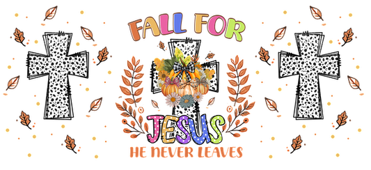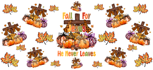 Este encantador gráfico con temática otoñal presenta calabazas, hojas otoñales y una cruz, que celebran el mensaje "Enamórate de Jesús". Transferencias UV