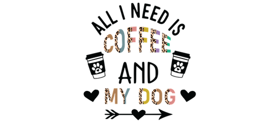 Diseño brillante y divertido que presenta la frase "Todo lo que necesito es café y mi perro", adornado con ilustraciones de tazas de café. Transferencias UV