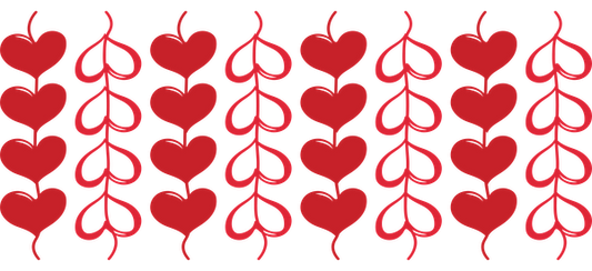 Un patrón vibrante que presenta corazones rojos entrelazados con hojas, perfecto para temas románticos o proyectos decorativos. Transferencias UV