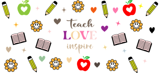 Una ilustración vibrante que presenta manzanas, lápices, flores y las inspiradoras palabras "enseñar, amar, inspirar" sobre un fondo negro. Transferencias UV