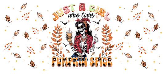 Un gráfico vibrante que presenta un esqueleto de moda con una chaqueta roja, rodeado de hojas de otoño y la frase "Just a Girl Pumpkin Spice". Transferencias UV