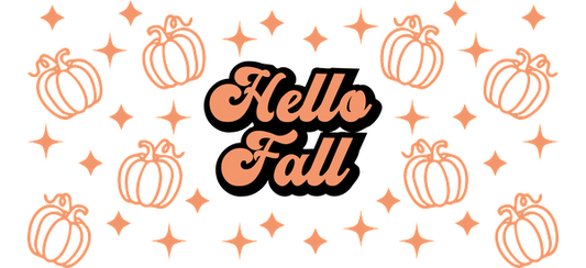 Gráfico encantador con temática otoñal que presenta el texto "Hola otoño" rodeado de calabazas ilustradas y estrellas brillantes en tonos cálidos. Transferencias UV