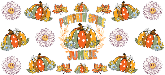 Un diseño vibrante con temática otoñal que incluye calabazas coloridas, margaritas alegres y la frase "Pumpkin Spice Junkie", perfecto para los amantes del otoño. Transferencias UV
