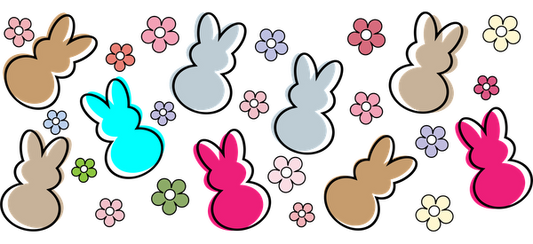 Una colorida variedad de siluetas de conejitos juguetones rodeados de flores vibrantes, creando una escena primaveral alegre y festiva. Transferencias UV