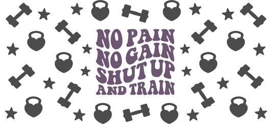 Tipografía en negrita de color violeta sobre una cita motivadora de fitness: "Sin dolor no hay ganancia, cállate y entrena". ¡Perfecta para los entusiastas del gimnasio! Transferencias UV