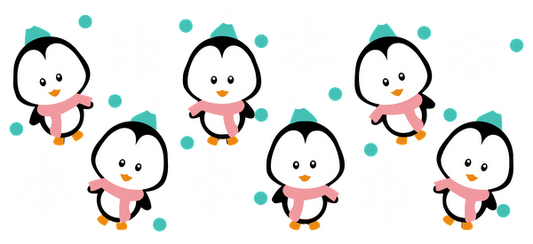 Un patrón alegre que presenta simpáticos pingüinos de dibujos animados con sombreros y bufandas, rodeados de copos de nieve y puntos de colores. Transferencias UV
