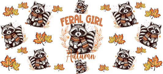 Un diseño caprichoso que presenta lindos mapaches con bufandas, rodeados de hojas de otoño y el texto "Feral Girl" en colores vibrantes. Transferencias UV.