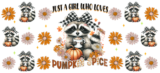 Un encantador diseño con temática otoñal que presenta mapaches, flores y una calabaza, que celebra el amor por la especia de calabaza con imágenes divertidas. Transferencias UV