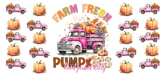 Un diseño encantador que presenta un camión vintage rosa lleno de calabazas y productos otoñales, con el texto "Calabazas frescas de granja". Transferencias UV