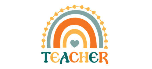 Un diseño colorido y alegre que presenta un arcoíris y la palabra "TEACHER" en letras divertidas, que simbolizan el aprecio por los educadores. Transferencias UV
