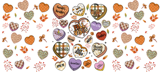 Un gráfico vibrante con temática otoñal que presenta corazones coloridos con frases como "Fall Vibes", "Pumpkin Spice" y "Blessed", adornados con hojas. Transferencias UV