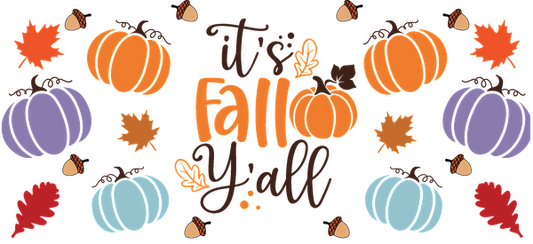 Celebre la temporada de otoño con este vibrante diseño "It's Fall Y'all" que presenta calabazas coloridas y hojas otoñales. Transferencias UV