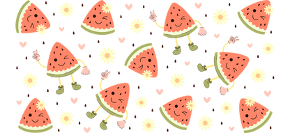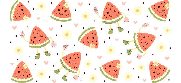 A cheerful pattern featuring cute, smiling watermelon slices with playful arms and flowers.UV Transfers