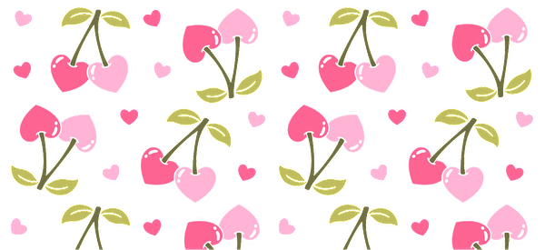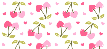 A cheerful pattern featuring pink heart-shaped cherries and small hearts on black.UV Transfers