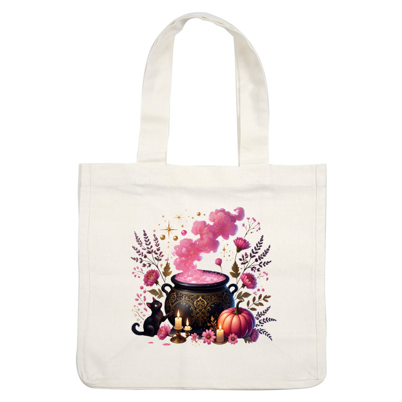 A magical black cauldron emits pink mist, surrounded by flowers, a pumpkin, candles, and a playful black cat.dtf regular iron