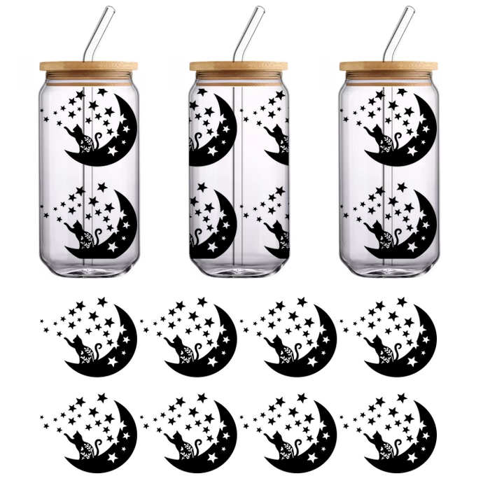 Una ilustración minimalista en blanco y negro de la silueta de un gato, que muestra su forma elegante y su postura grácil. Transferencias UV