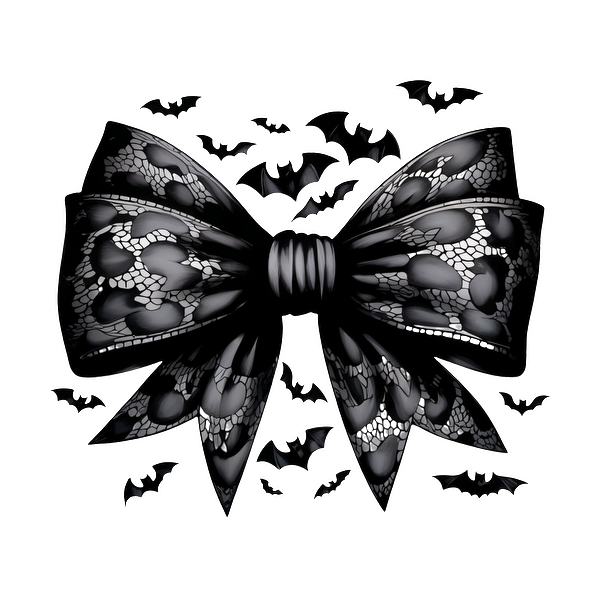 A stylish black lace bow adorned with bat patterns, perfect for a spooky yet fashionable touch. dtf transfers