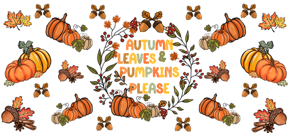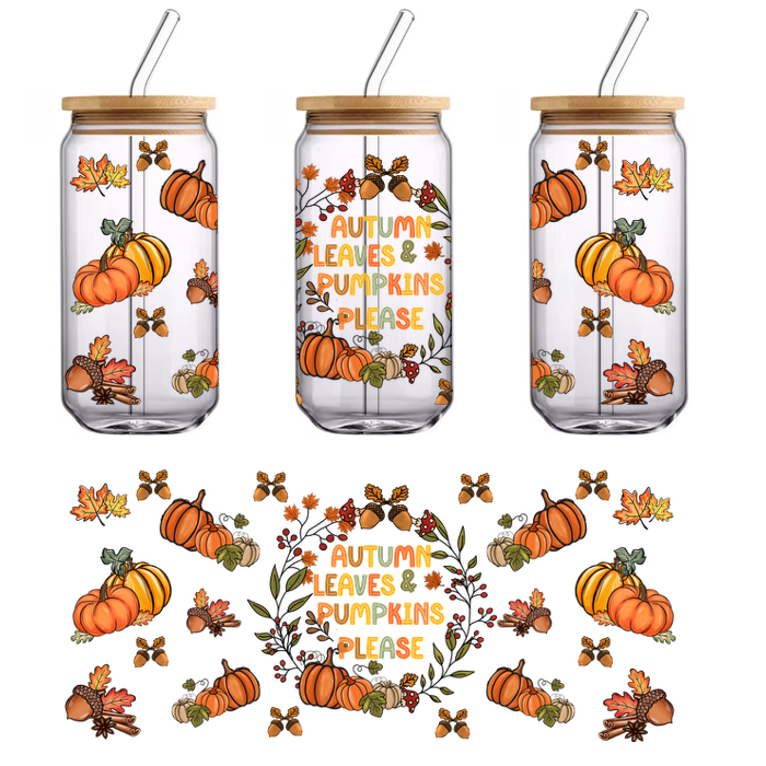 Celebre la temporada con esta vibrante obra de arte con temática otoñal que incluye calabazas, hojas y colores alegres. Transferencias UV