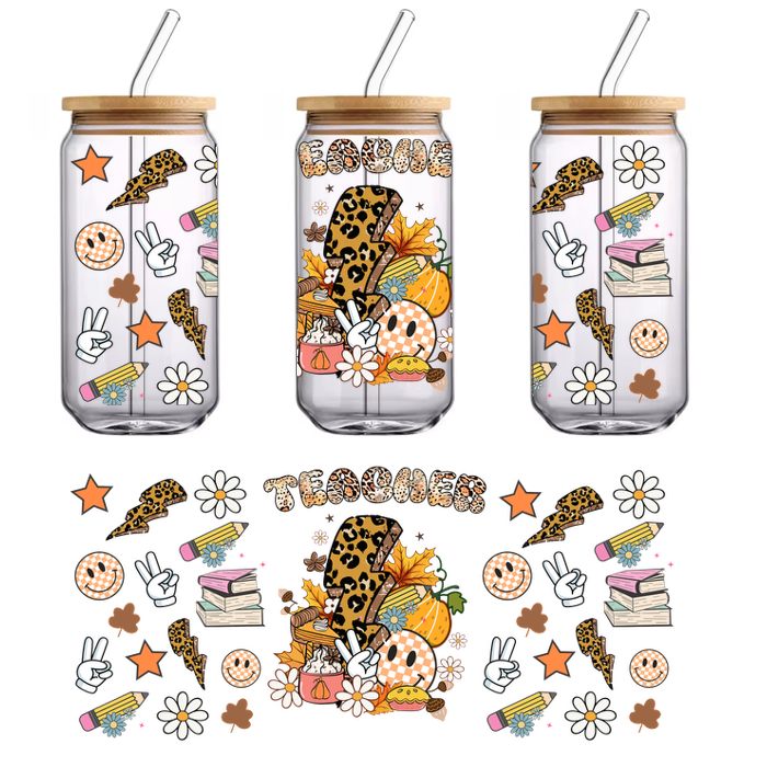 Ilustración colorida y divertida que celebra a los maestros, con estampado de leopardo, libros, hojas de otoño e íconos alegres como símbolos de la paz y flores. Transferencias UV