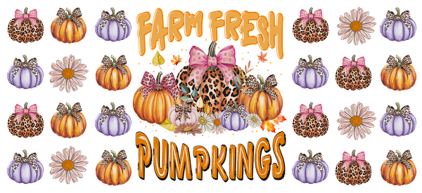 Diseño otoñal vibrante que presenta una combinación de calabazas con estampado de leopardo, flores coloridas y el texto "Calabazas frescas de granja". Transferencias UV