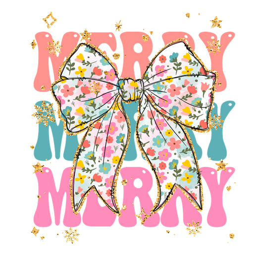 Colorful "MERRY" text adorned with a floral bow and festive sparkles, perfect for holiday celebrations and cheerful greetings.DTF Transfers dtf prints