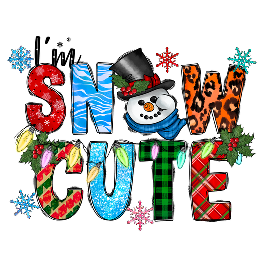 Celebrate the season with this cheerful "Snow Cute" design featuring a playful snowman and colorful, festive lettering.DTF Transfers heat press transfers