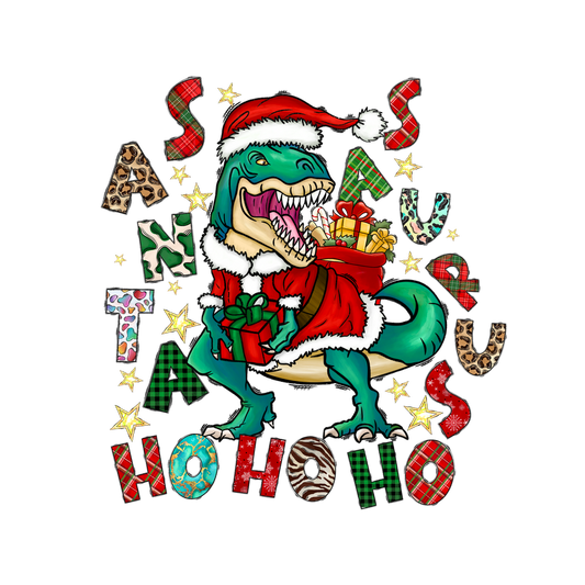 A festive dinosaur in a Santa hat holds presents, surrounded by colorful letters and stars, spreading holiday cheer.DTF Transfersdtf regular iron