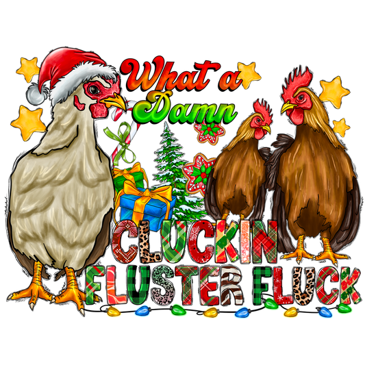 Celebrate the festive spirit with this fun, colorful graphic featuring chickens in Santa hats and vibrant holiday decorations!DTF Transfers dtf prints