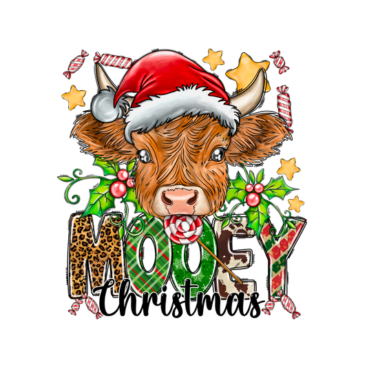 Celebrate the holidays with this cheerful illustration of a cow in a Santa hat, adorned with festive decorations and candy canes!DTF Transfers dtf prints
