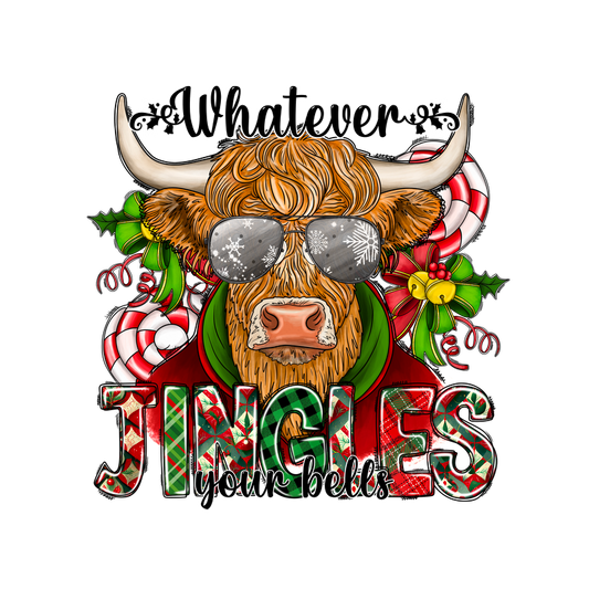 A whimsical holiday design featuring a cool cow wearing sunglasses, surrounded by festive candies and the phrase "Whatever Jingles your bells."DTF Transfersdtf regular irondtf regular iron