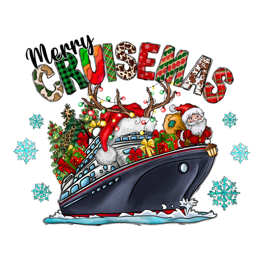 Celebrate the festive spirit with a whimsical "Merry Cruisemas" design featuring Santa on a decorated cruise ship surrounded by gifts and snowflakes.DTF Transfersdtf regular iron dtf transfers