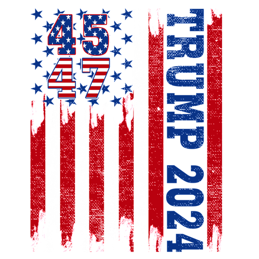 A bold graphic featuring a distressed American flag design with "TRUMP 2024" and the numbers "45" and "47" prominently displayed.DTF Transfers dtf transfers heat press transfers