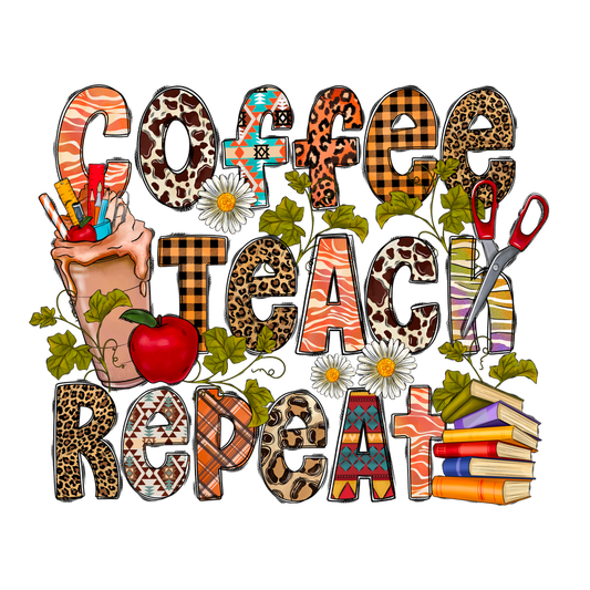 A vibrant, themed design featuring the phrase "Coffee, Teach, Repeat" with playful elements like a coffee cup, apple, flowers, and books.DTF Transfers heat press transfers dtf prints