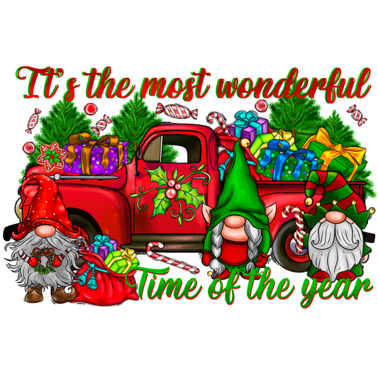 Celebrate the season with a cheerful illustration featuring gnomes, a vintage red truck, and festive gifts under a vibrant holiday message.DTF Transfers dtf transfersdtf regular iron