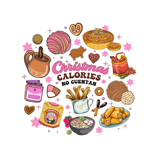 A festive collection of delicious holiday treats, including hot chocolate, churros, cookies, and other sweet delights, celebrating Christmas calories!DTF Transfersdtf regular irondtf regular iron