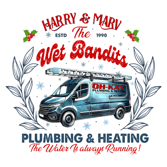 A festive illustration featuring a plumbing and heating van adorned with holiday decorations, showcasing the "Wet Bandits" theme.DTF Transfers dtf prints