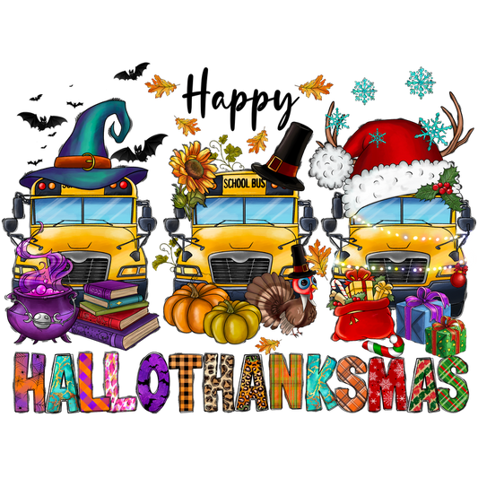 A whimsical illustration featuring three festive school buses adorned with seasonal hats and surrounded by autumn and holiday decorations.DTF Transfersdtf regular iron dtf transfers