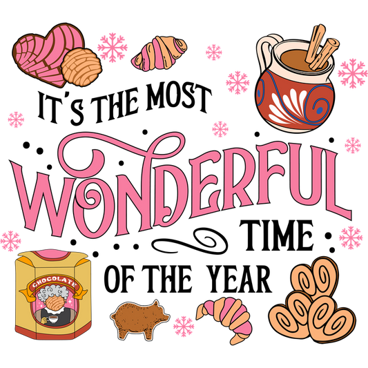 Delight in this colorful assortment of sweet treats, including hearts, croissants, and hot chocolate, framed by the word "Wonderful."DTF Transfers dtf transfers
