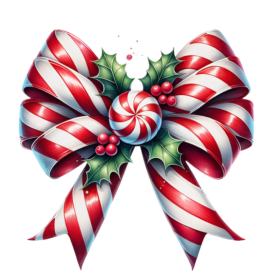 A festive red and white striped bow adorned with candy, holly leaves, and berries, perfect for Christmas decorations. dtf transfers