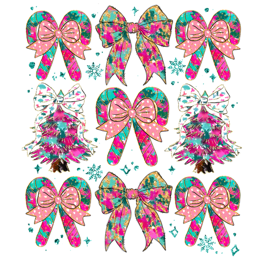 A vibrant pattern featuring colorful bows, candy canes, and whimsical Christmas trees, perfect for festive decorations or apparel.DTF Transfers dtf prints