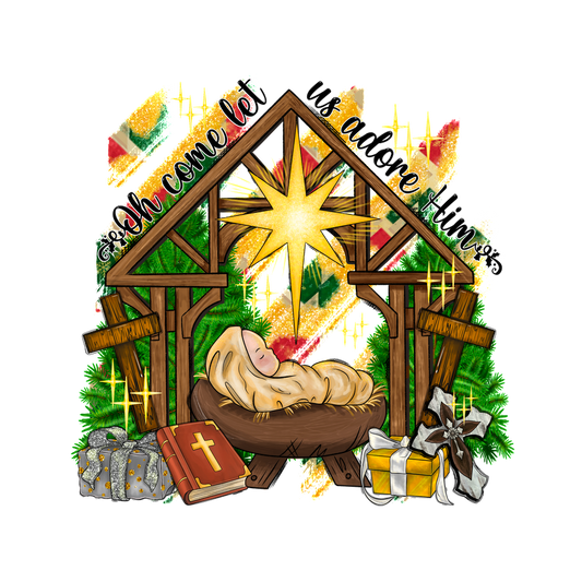 A charming nativity scene featuring a peaceful baby in a manger, surrounded by gifts and decorated with festive greenery.DTF Transfers dtf transfers