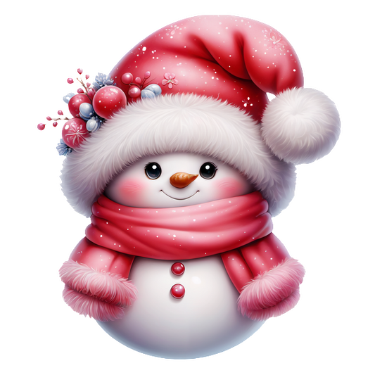 This charming snowman features a rosy smile, a fluffy pink hat adorned with berries, and a cozy scarf for winter cheer.