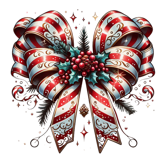 A festive Christmas bow with red and white stripes, adorned with holly leaves and berries, sparkling with decorative elements. heat press transfers