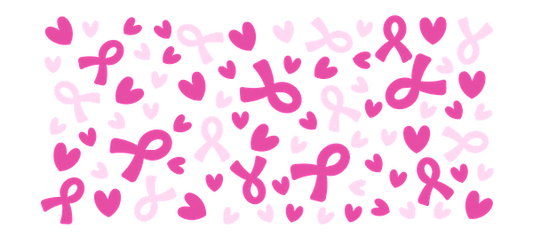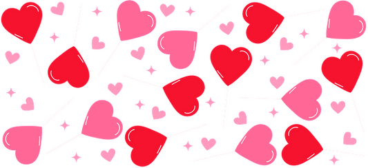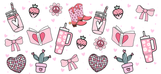 A black background filled with pink and white hearts, flowers, and a glass.UV Transfers