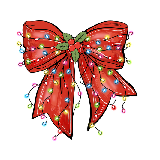 A vibrant red Christmas bow adorned with colorful lights and a touch of greenery, perfect for festive decorations. heat press transfers