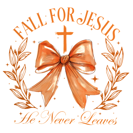 A lovely illustration featuring a bow, a cross, and the phrase "Fall for Jesus, He Never Leaves," surrounded by leaves.dtf regular iron