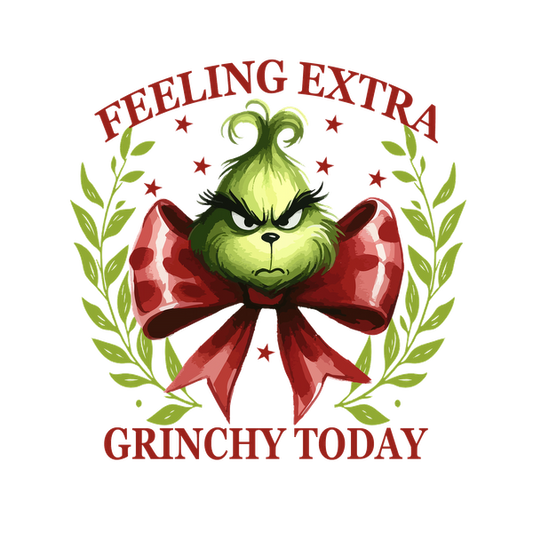 A whimsical design featuring the Grinch with a red bow, proclaiming "Feeling Extra Grinchy Today," surrounded by festive greenery. heat press transfers