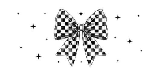 A black and white checkered bow on a green background.UV Transfers