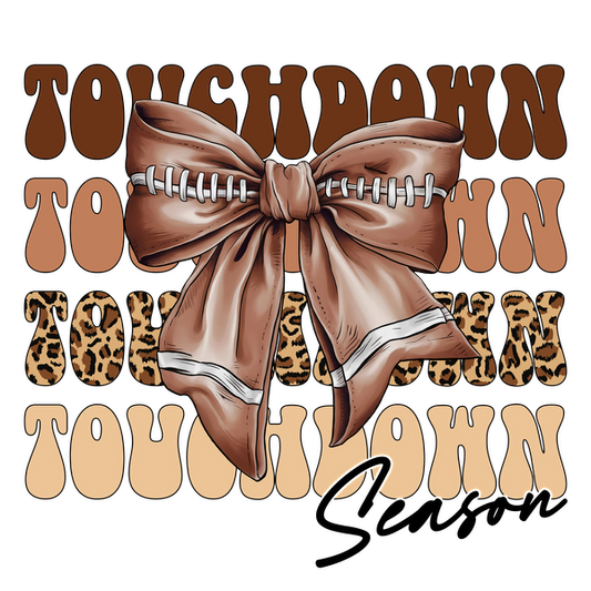 A playful graphic featuring the word "TOUCHDOWN" with a stylish football-themed bow and fun animal print accents. dtf transfers